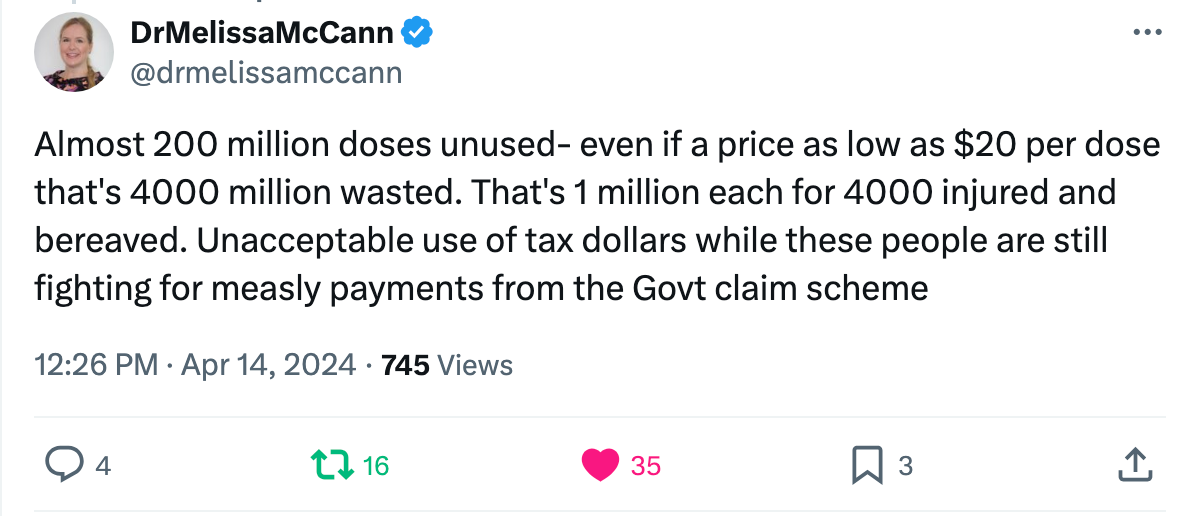 “Almost 200 million doses unused- even if a price as low as $20 per dose that's 4000 million wasted. That's 1 million each for 4000 injured and bereaved. Unacceptable use of tax dollars while these people are still fighting for measly payments from the Govt claim scheme”