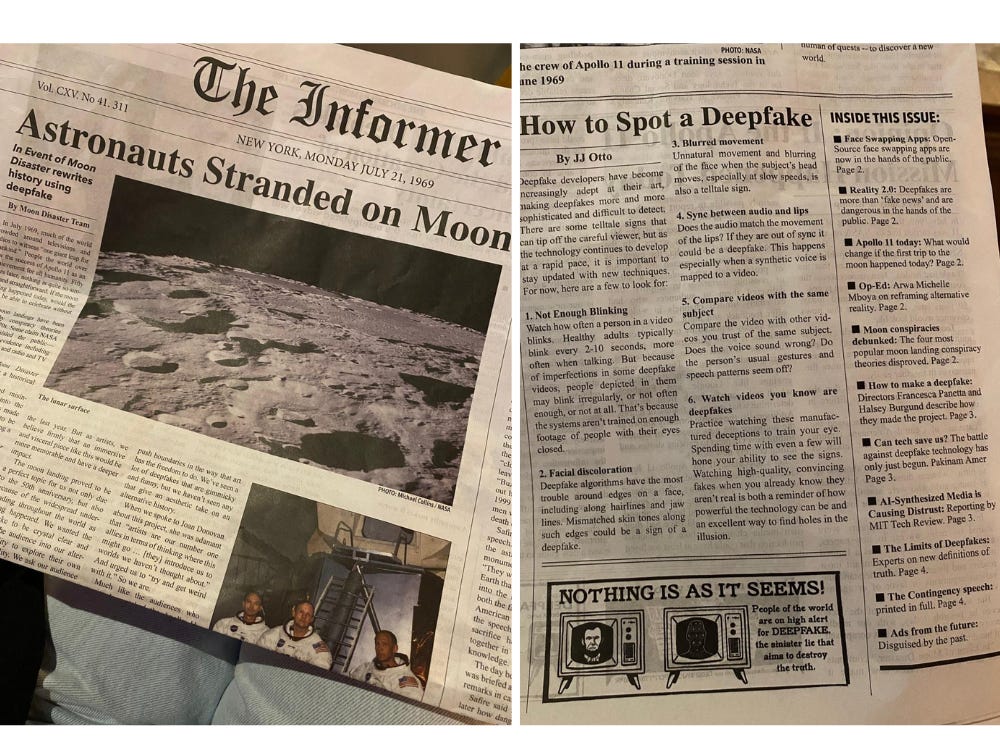 I went to a moon-themed exhibition at the museum on the weekend. Curiously, there was a whole section dedicated to deepfake education, featuring a fake televised moon landing scenario (astronauts were stranded) and a fake newspaper. Punters could flop on the 60’s themed sofas and read about how to spot a deepfake, and debunked moon conspiracies.