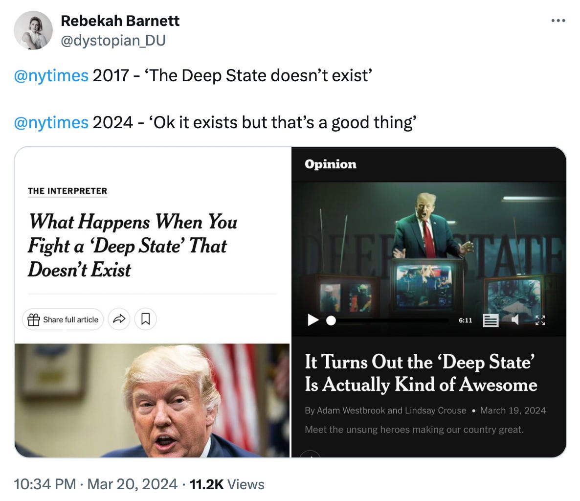 FYI everyone, the New York Times has done an about-face on the deep state. When Trump said there was a deep state, NYT said that wasn’t true because orange man derp. Now NYT says the deep state does exist, but Trump is still wrong to criticise it because it’s actually just a group of “unsung heroes making our country great,” and that “just because we don’t know about it, doesn’t make it suspicious.” *NPCs update programming*