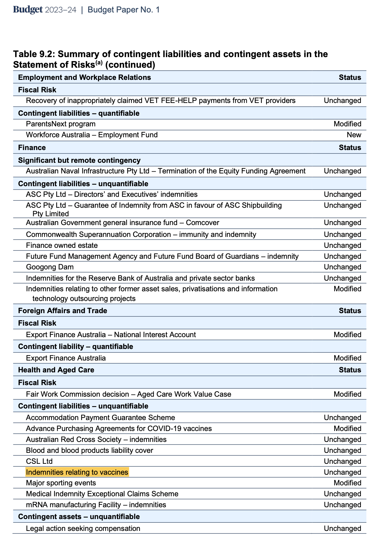 “The Federal Budget papers for 2023-24 contain multiple, ‘unquantifiable contingent liabilities’ relating to vaccines. The unquantifiable liability stems from the fact that indemnity has been granted for Covid-19 vaccines.