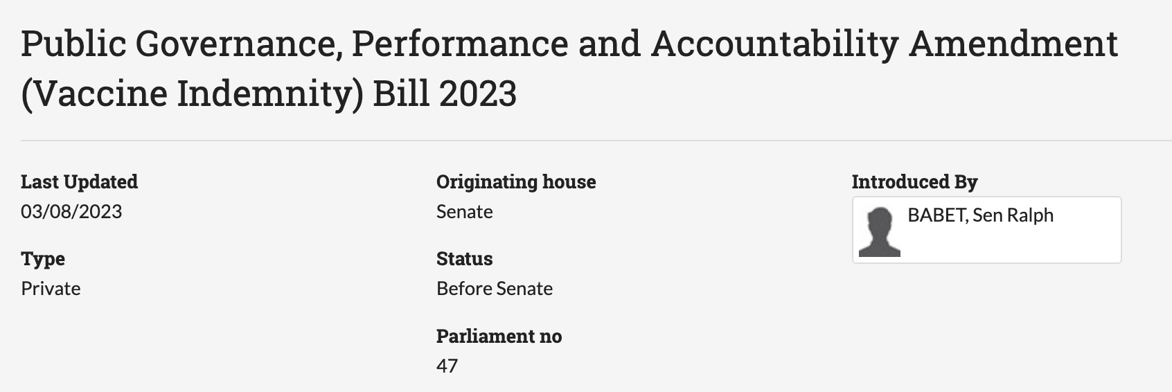 Senator Babet says that the bill will prevent the Australian Government from granting indemnity to vaccine manufacturers, which will in turn, “limit financial and legal risk to the Commonwealth and aid in the restoration of trust in medicine.”