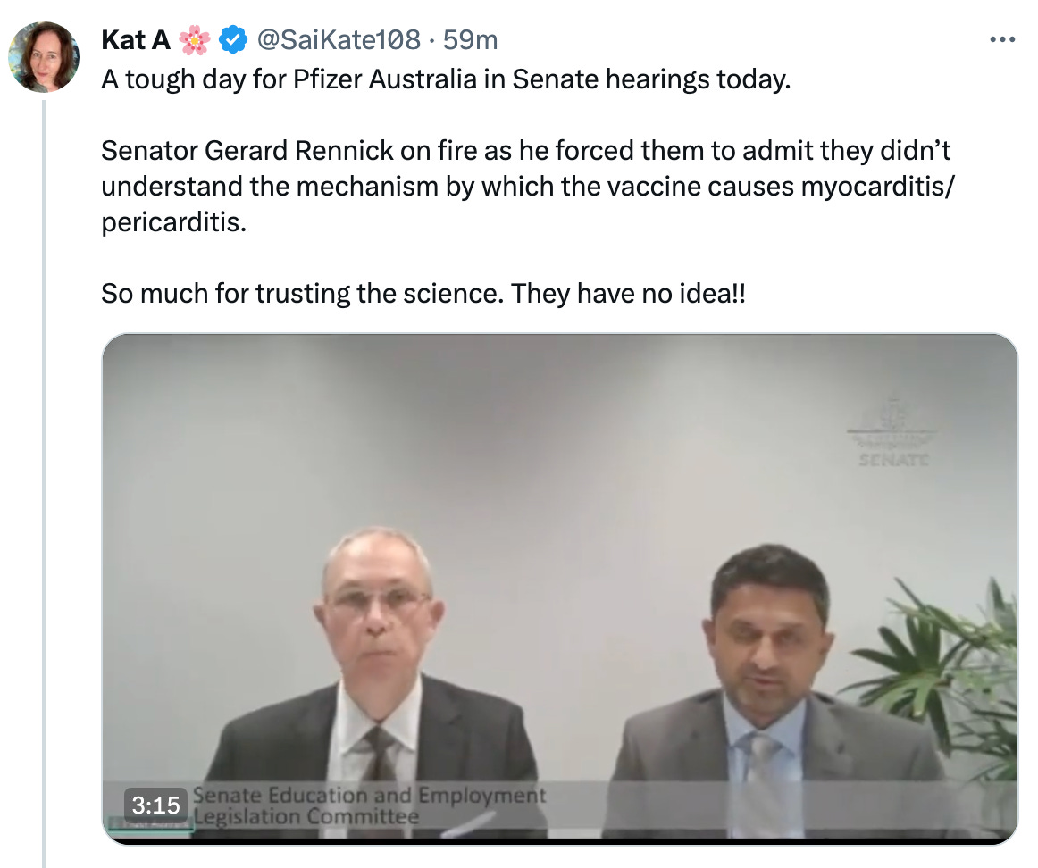 In Senate hearings also today, Pfizer representatives were not able to answer Senator Gerard Rennick’s simple question, ‘can you explain the mechanism by which the vaccine causes myocarditis and pericarditis?’. After three minutes of interjecting on the Pfizer bots reiterating that the benefits outweigh the risks in response to a question that was evidently not in their FAQ database, Senator Rennick gave up and moved on. Click through to watch here.