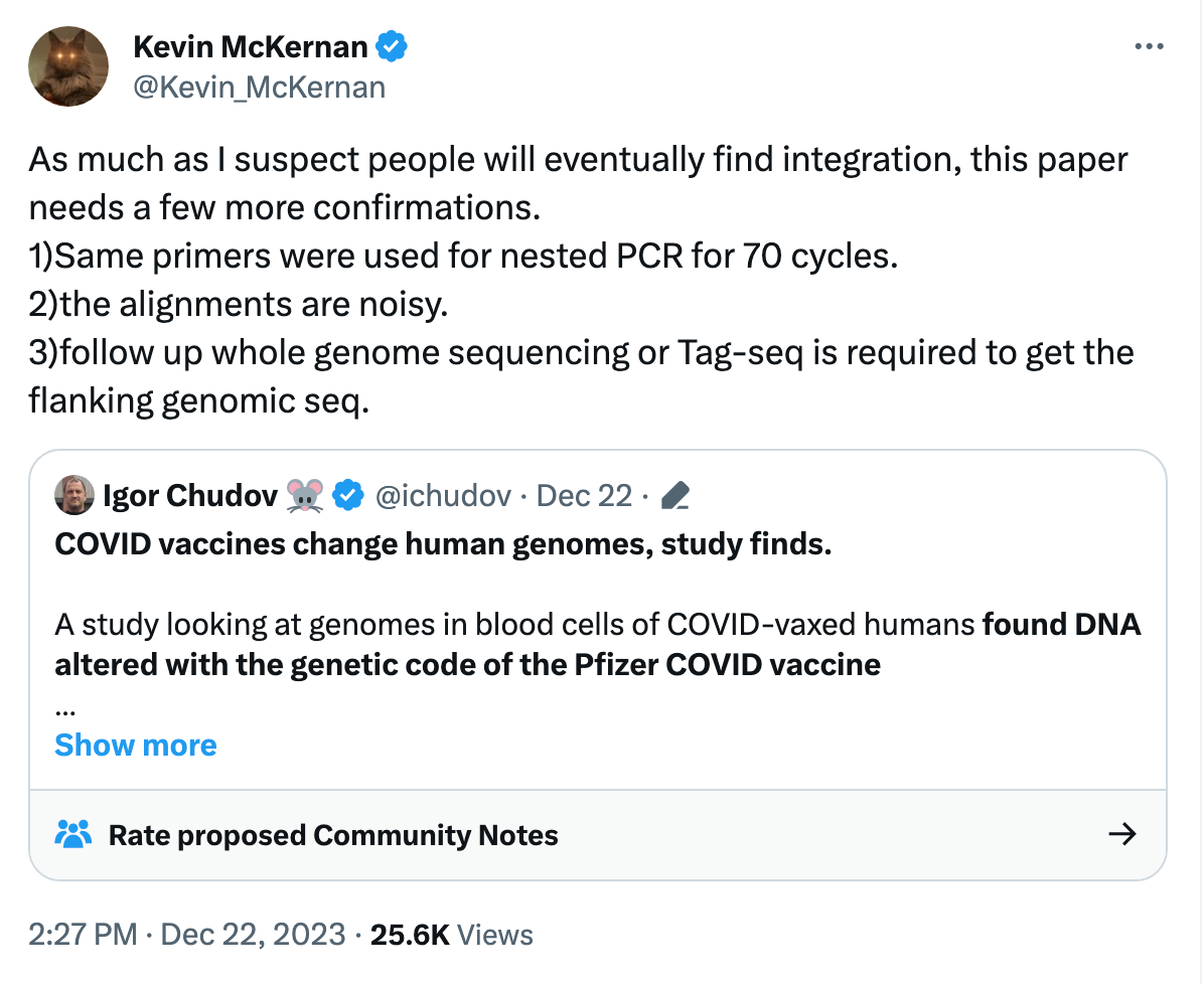 McKernan notes that the authors put the finding that implies genomic integration in the supplement section, “as I think they know it’s a very speculative find.” He also points out that the PCR cycles they used were very sensitive, producing “noisy” results.