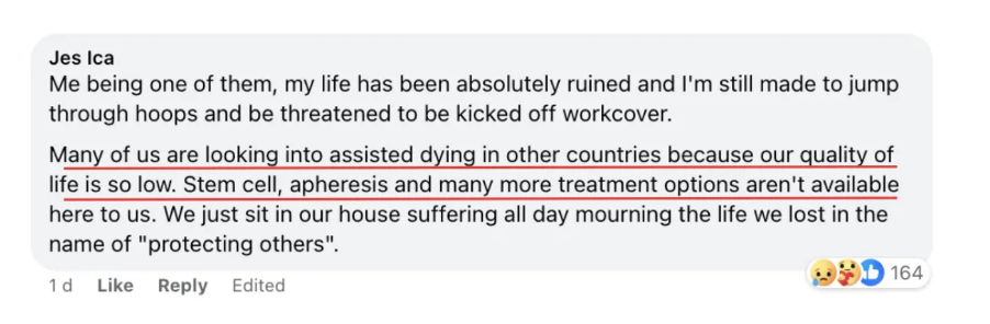 While official sources state that most Covid vaccination side effects are mild and resolve quickly, multiple commenters discussed life-changing injuries rendering themselves or their loved ones unable to walk, work or participate in society. Some are actively looking to access euthanasia due to their suffering.