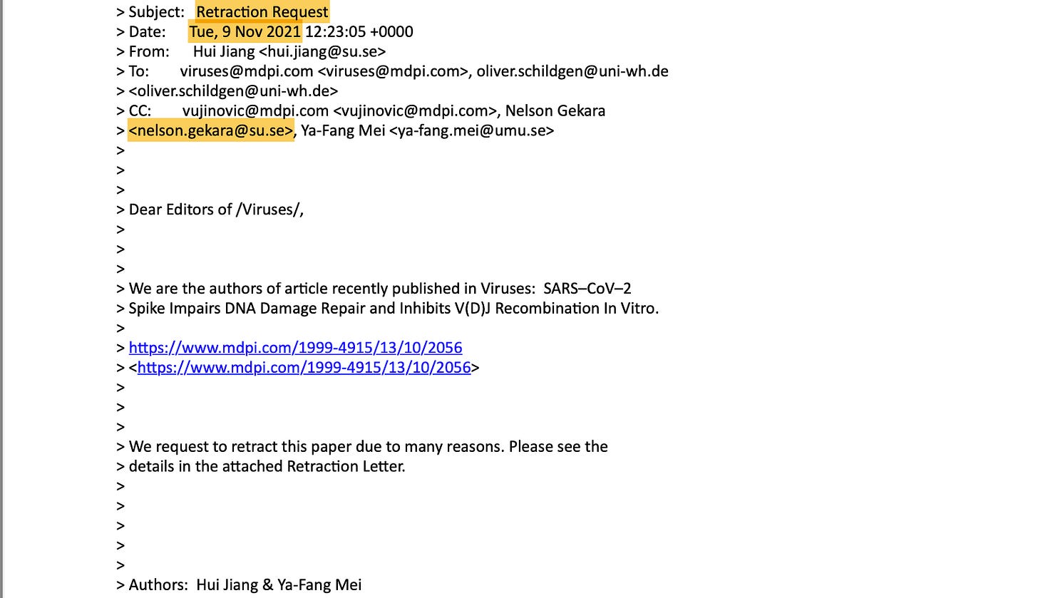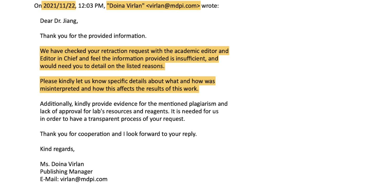 Under FOIA, I was able to obtain a copy of Jiang’s letter requesting retraction of his paper, which he emailed to the journal on 9 November 2021. This is the letter that MDPI Academic Editor Oliver Schildgen described as “rather generic.”