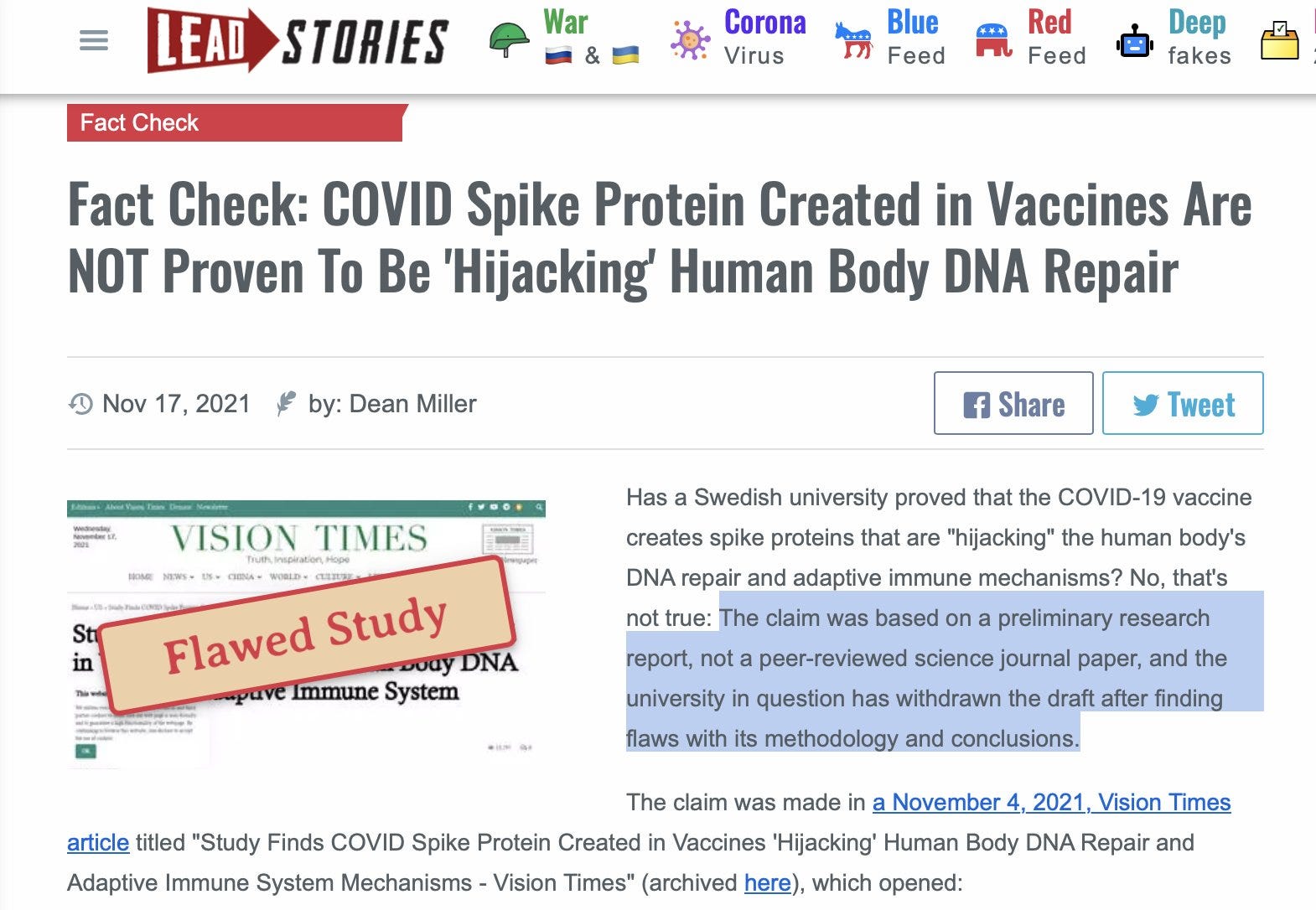 Leading to this erroneous ‘fact check’ by Lead Stories journalist Dean Miller, who falsely claimed that the paper was not peer reviewed, but a “preliminary research report” in “draft” form.