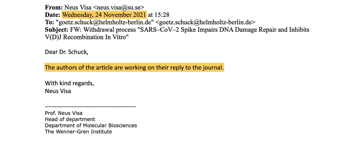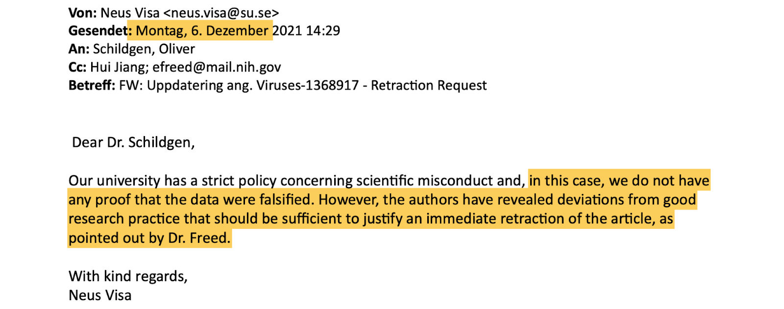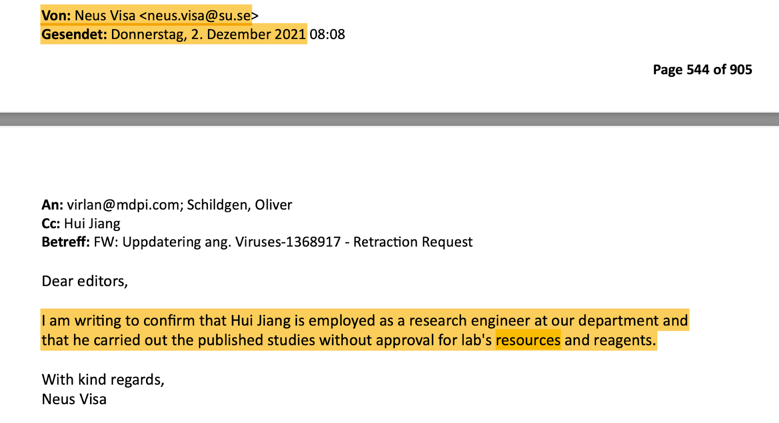 In a reply to Schuck, Prof Neus Visa, Head of the Wenner-Gren Institute where Hui Jiang worked, assured Schuck that “the authors of the article are working on their reply to the journal.” She immediately forwarded the exchange to her counterpart at Umeå University, Anders Sjöstedt, who replied ‘thanks.’
