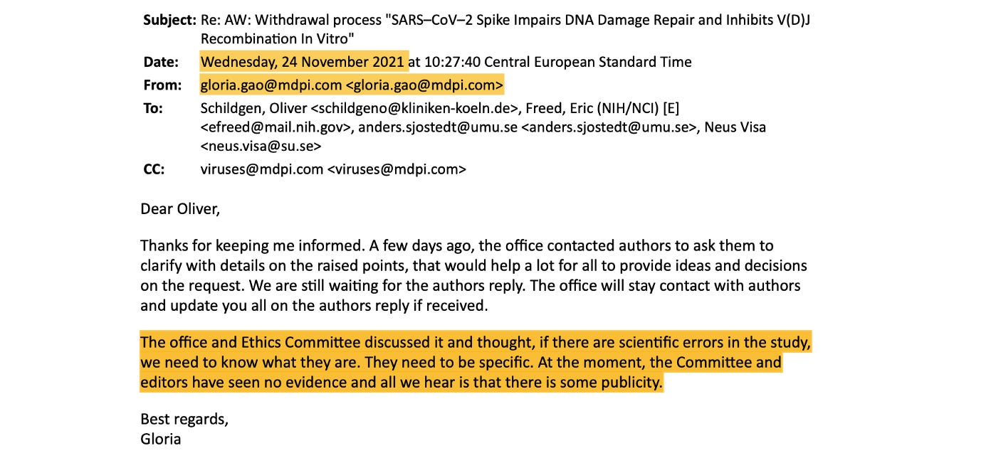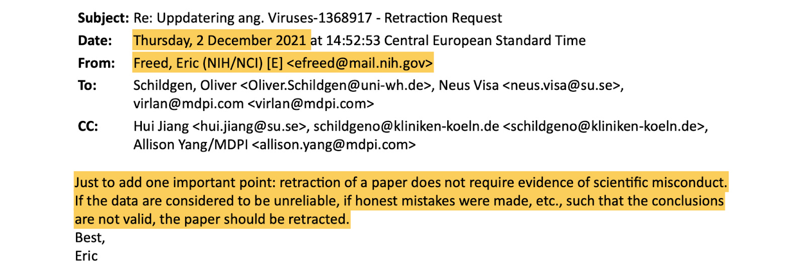 In August 2022, Davidson submitted a Freedom of Information Access request (FOIA) for emails between MDPl’s Chief Editor, Eric Freed and Academic Editor Oliver Schildgen regarding the retraction. “As a member of the National Cancer Institute [operating under the US federal National Institutes for Health], Freed’s communications are supposed to be open to the public,” said Davidson.