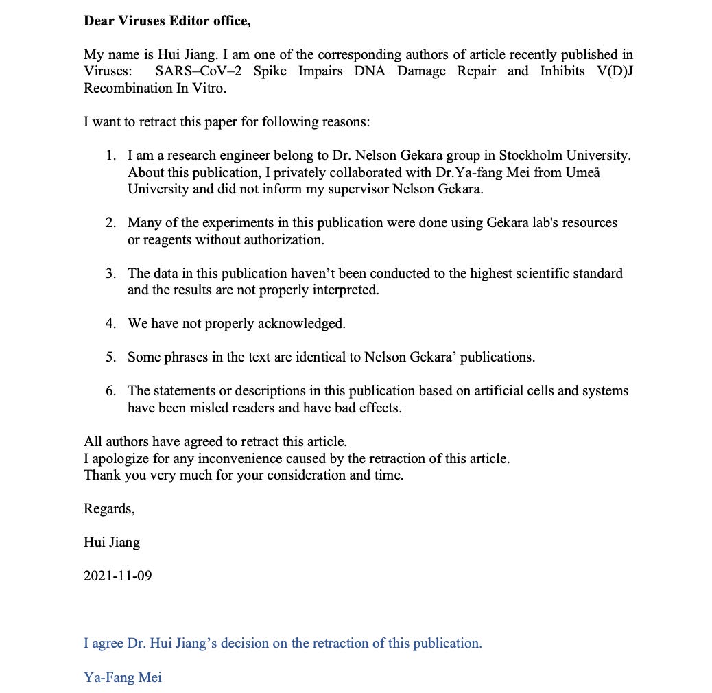 Note that Hui Jiang’s retraction request letter was sent on 9 November, the day after Stockholm University’s internal investigation was initiated. Jiang’s supervisor, Nelson Gekara, is CCed.
