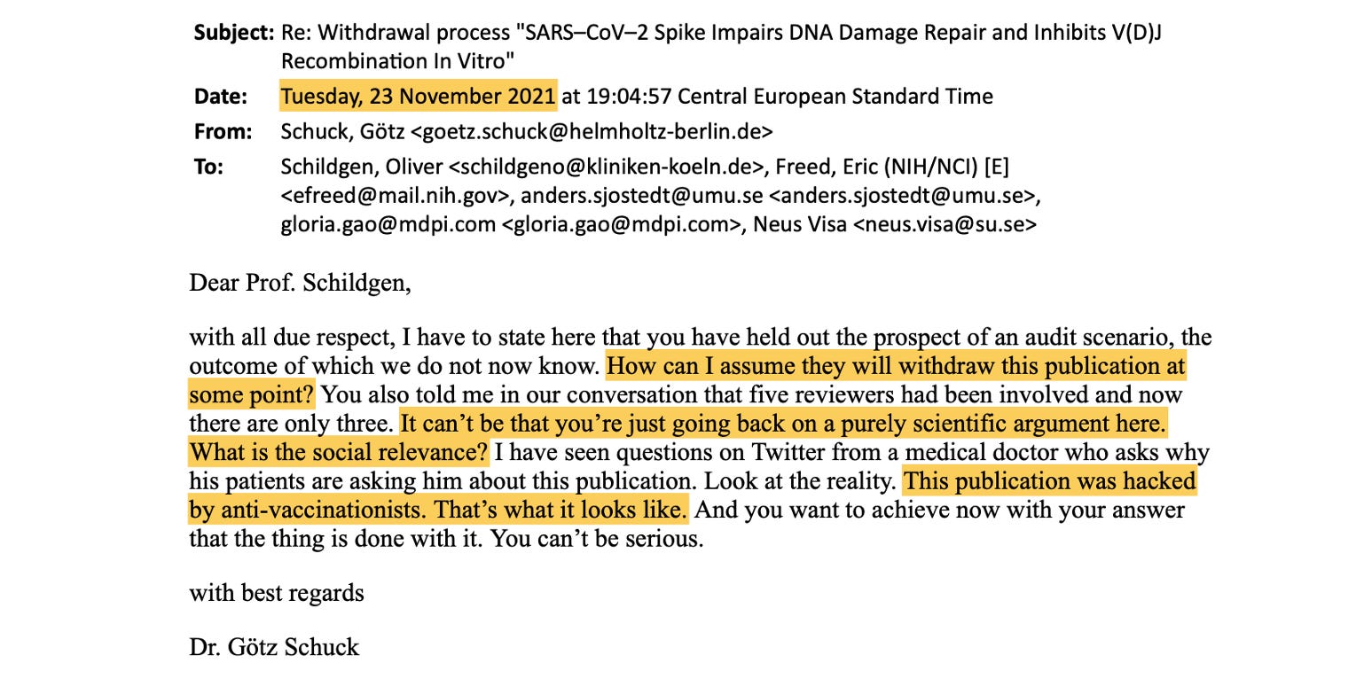 However, Schuck was not placated. He emailed a third time, alleging that MDPI had been “hacked by anti-vaccinationists” and criticising the journal for seeking a scientific explanation for retraction without taking “social relevance” into account.