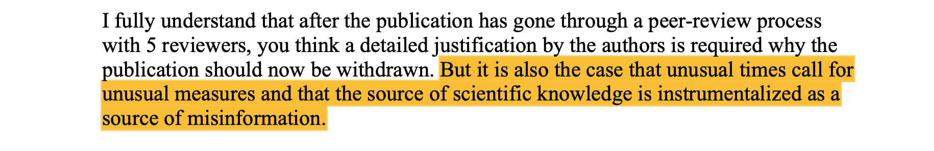 He urged the journal to bypass normal retraction processes and immediately withdraw the paper because “unusual times call for unusual measures.”