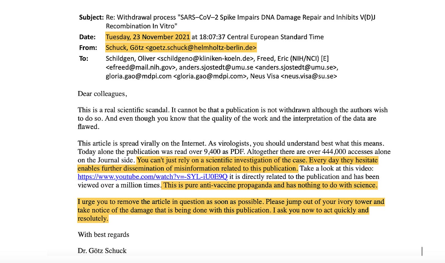 In a follow up email the next day, this time with Stockholm University included, Schuck catastrophised over the “scientific scandal” of the paper remaining online with nearly half a million downloads, urging the journal to “remove the article in question as quickly as possible.”