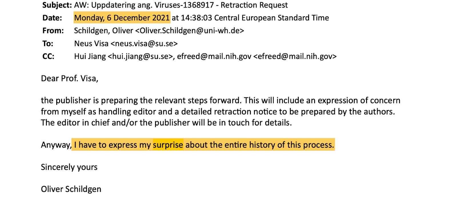 Schildgen replied assuring that correct procedures were being followed, and recommending that any further issues be raised with the Chief Editor (NIH scientist Dr Eric Freed), to whom he formally handed over the case.