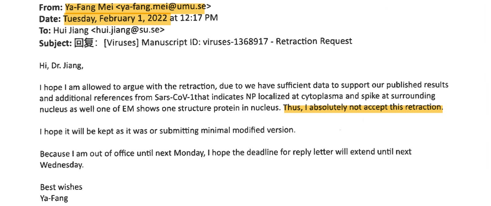 A retraction notice published in May 2022 cited concerns about the construction of the spike plasmid and the use of a GFP reporter system, rendering the paper unreliable to scientists or commentators wishing to reference or build upon Jiang and Mei’s findings.