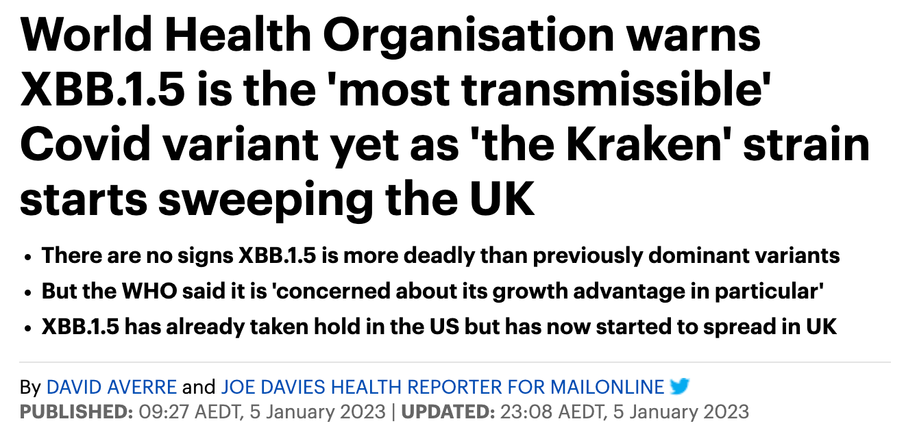 No, it’s not a scary movie, it’s yet another Covid variant. The Daily Mail reports that new variant XBB.1.5, dubbed ‘The Kraken’ (by who? seriously), is in town and it’s transmissible as hell.