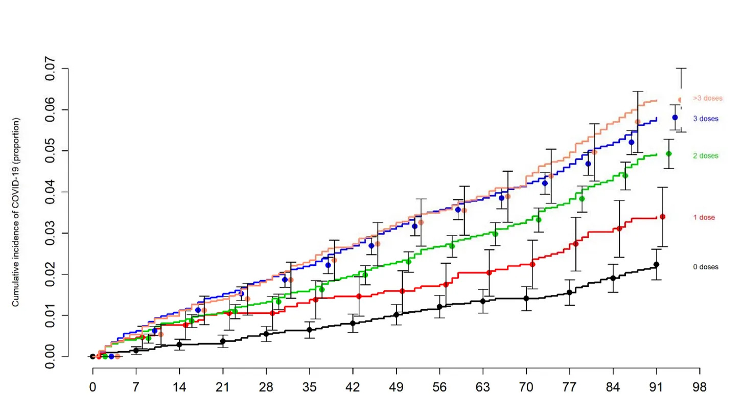 The author then moves on the rather stunning Cleveland Clinic study,1 which found that, not only did the bivalent booster only provide only 30% protection at the peak of the BA.5 variant (the WHO stipulates a minimum efficacy rate of 50% as benchmark for Emergency Use Listing), but that risk of infection increased with additional doses of Covid vaccination.