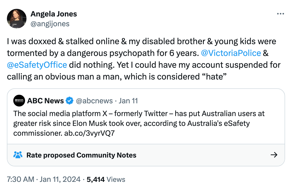 As example, in a post on X in January this year, sex-based rights campaigner Angela Jones claimed that eSafety did not act on her complaint to the regulator after she was doxxed and stalked online.