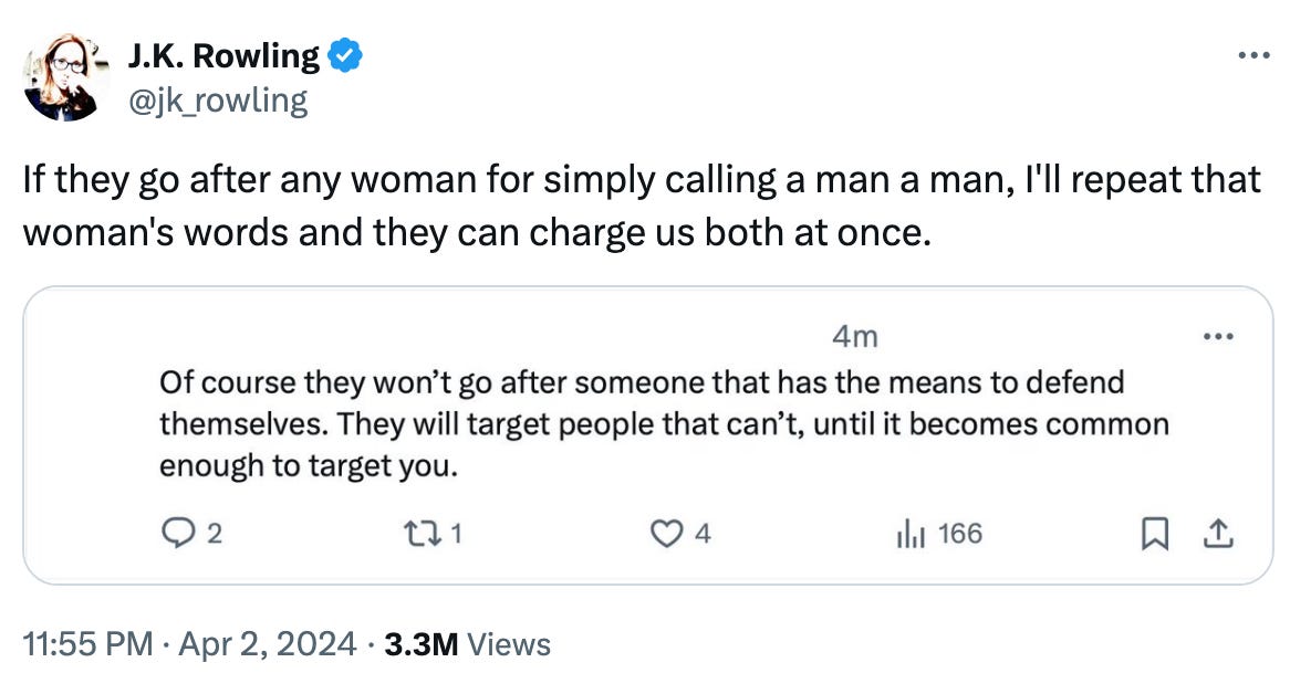 On the 1st of April, the day that the hate crime laws came into effect, Rowling made a series of posts to X describing several trans-identified individuals - including convicted sex offenders and media personalities - by their natal sex. According to Scotland’s minister for victims and community safety, Rowling’s act could get her arrested. Rowling dared the Scottish police to go through with it.