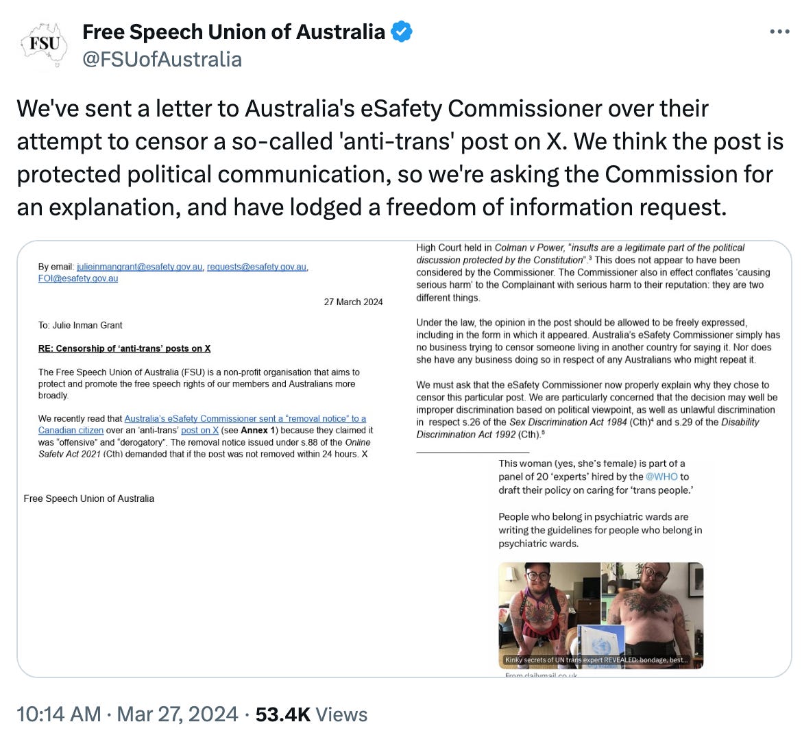 The FSU is now working with Elston on his appeal against eSafety’s censorship of his post.