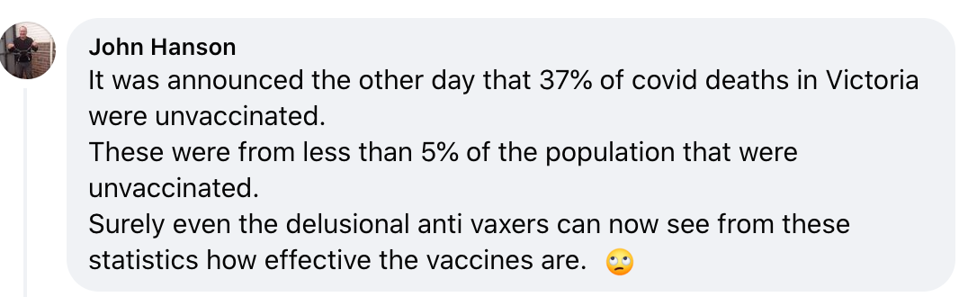 It is of concern to me that when trustworthy sources (government, legacy media) report false and misleading statistics, the general reader is inclined to take the misrepresentation as fact, to the point of denying all evidence (or possibility) of the contrary. Take John, who I found lurking in the comments thread under a WA Government post pushing Covid vaccines: