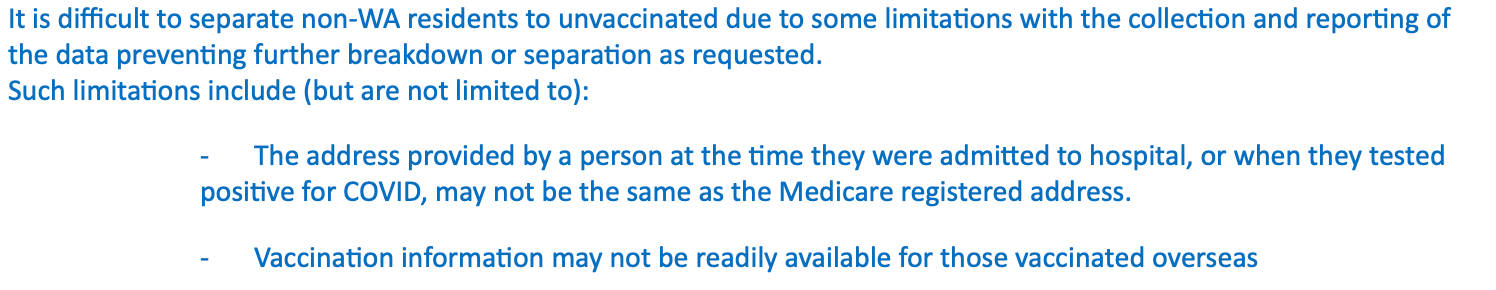 This statement is characteristically unclear, but we can glean that Unknown cases are non-WA residents, and/or people who have not updated their Medicare address, and/or people who have been vaccinated overseas. Most significantly, the Unknown group includes vaccinated hospital admissions. Therefore, the combined Not Vaccinated group in WA Health report clearly includes people with 1 or more doses of vaccination.