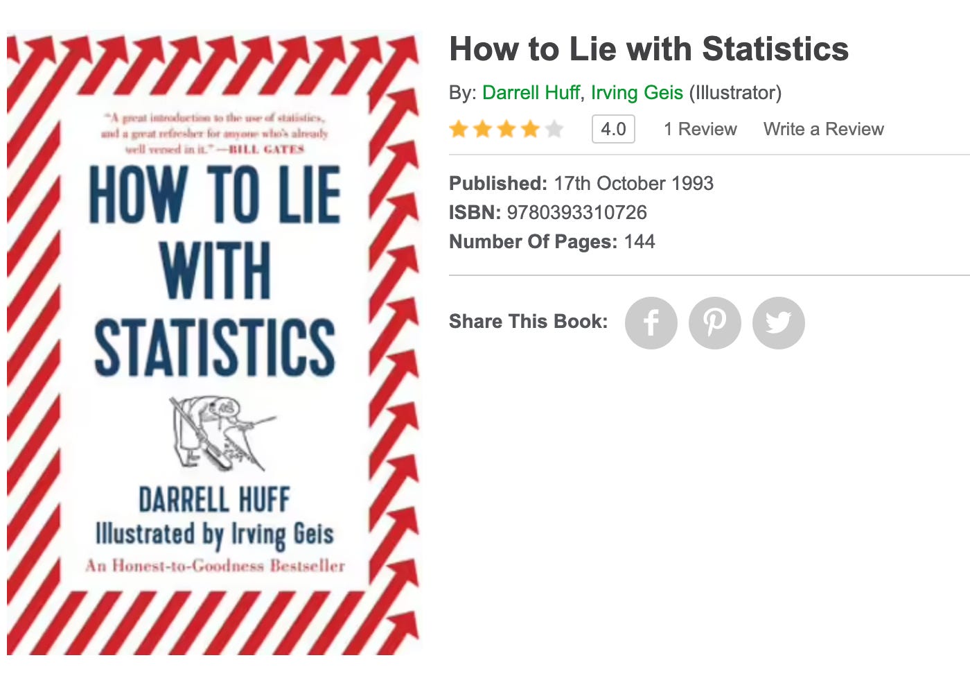 How to Lie with Statistics, OG edition: My sister recommended this book to me, and in lieu of legacy media applying any critical lens whatseover to government press releases in the past couple of years, I’ve bought myself a copy too. Here is a neat summary of what you can expect to learn. Note - highly recommended by Bill Gates (see cover).