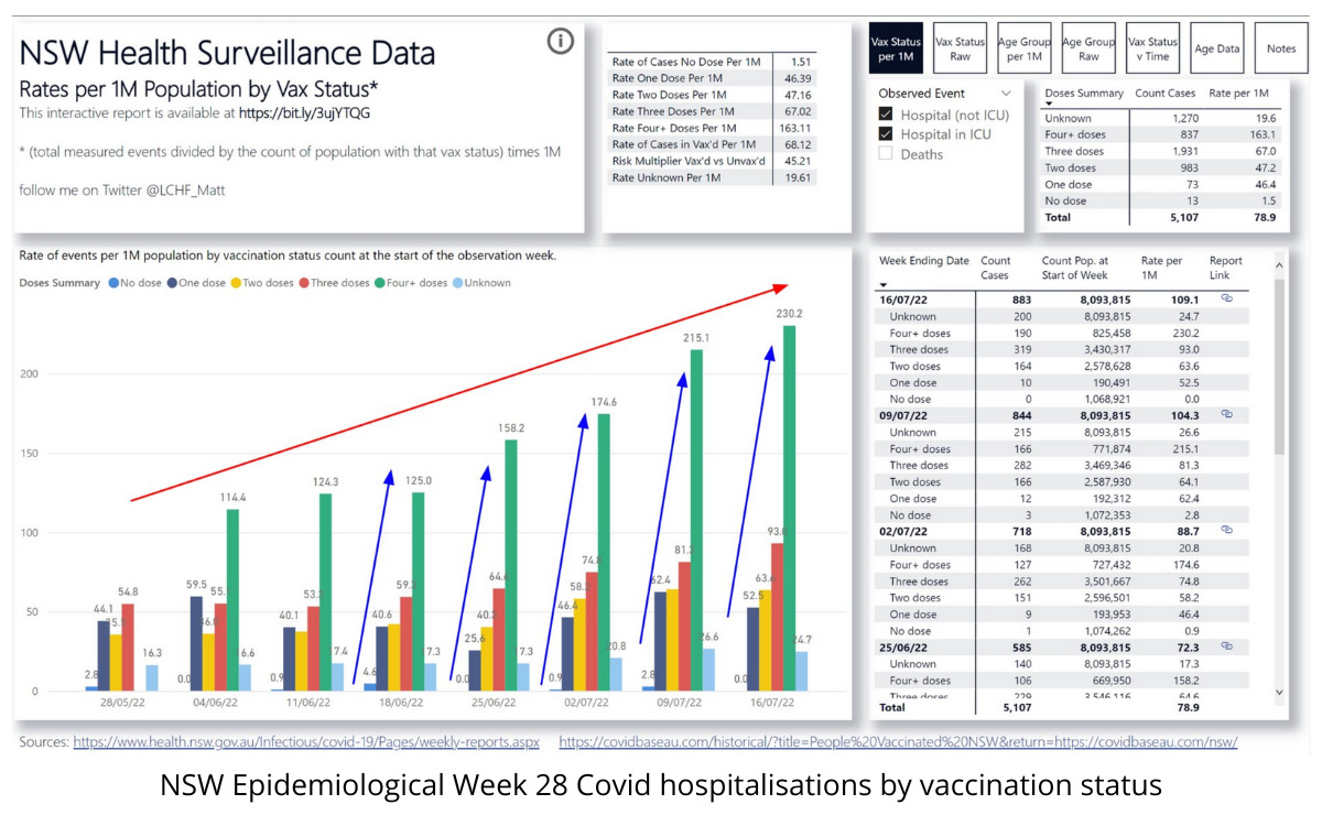 These faulty stats are proffered to pressure the under-vaccinated (because the goalposts are shifting from ‘fully vaxxed’ to ‘up to date’) to get ever more doses as they roll out. Booster uptake is lagging Down Under, and one of the most effective ways to push uptake is the threat of hospitalisation or death, as we’ve seen from the pandemic playbook since vaccine roll out in February 2021.