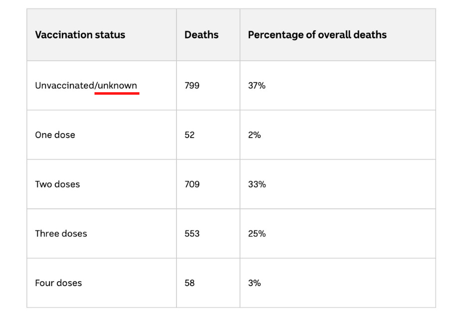 Though John did not differentiate between Unvaccinated and Unknowns, the journalist notes that, “The department said that people whose vaccination status was categorised as "unknown" until it's established, usually make up about 3 per cent of deaths.” I would like to know how the department knows this, and if they know it, why don’t they report Unvaccinated and Unknown as separate line items.