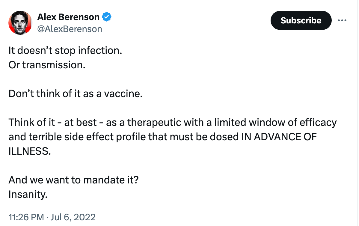 And back in the US, independent journalist Alex Berenson (formerly of the New York Times) is suing Pfizer board member Scott Gottlieb for allegedly pressing Twitter to ban him over factually accurate tweets criticising the mRNA vaccines. Berenson previously sued Twitter for wrongfully banning his account, settling with the social media company in 2022 for an undisclosed sum.