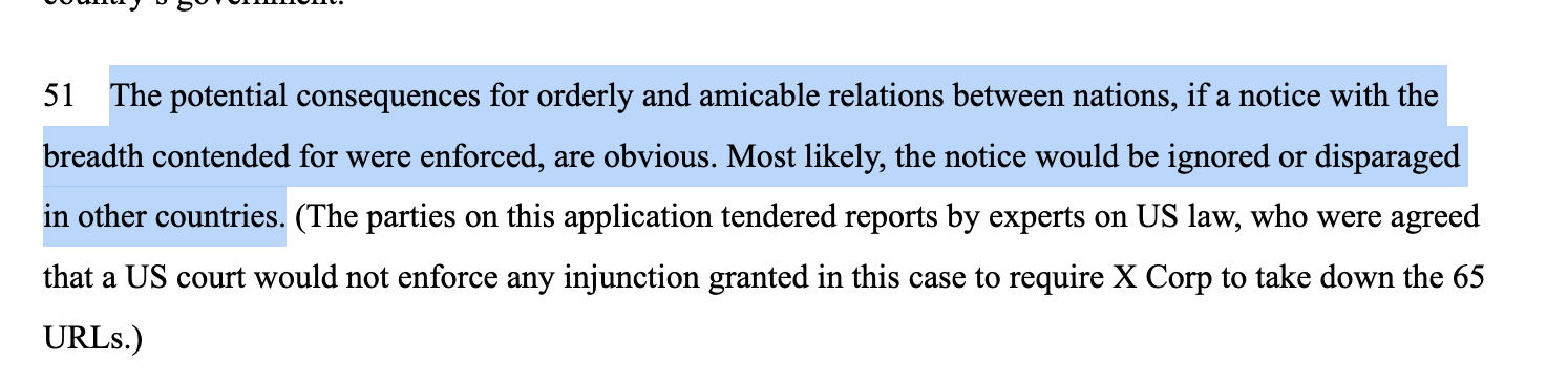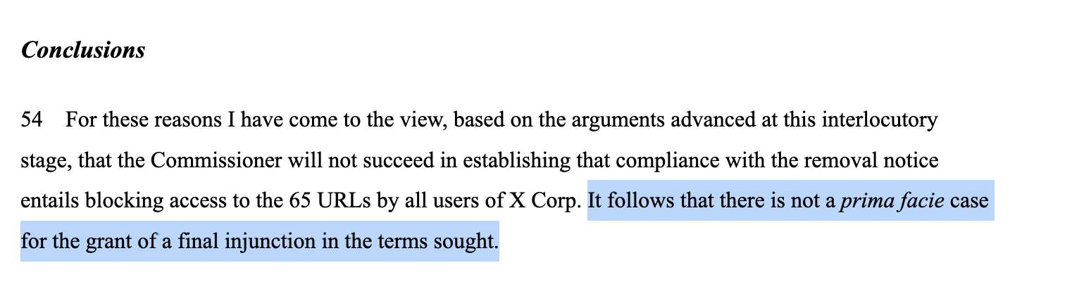 Thanks Rebekah. It would be astonishing if an Australian bureaucrat (or, indeed, any bureaucrat anywhere) could legally control the global Internet, with massive implications, so I'm pleased to see this sensible decision. It will be interesting to see how Australian media deal with this, after labelling Musk as the bad guy, in some cases spectacularly.