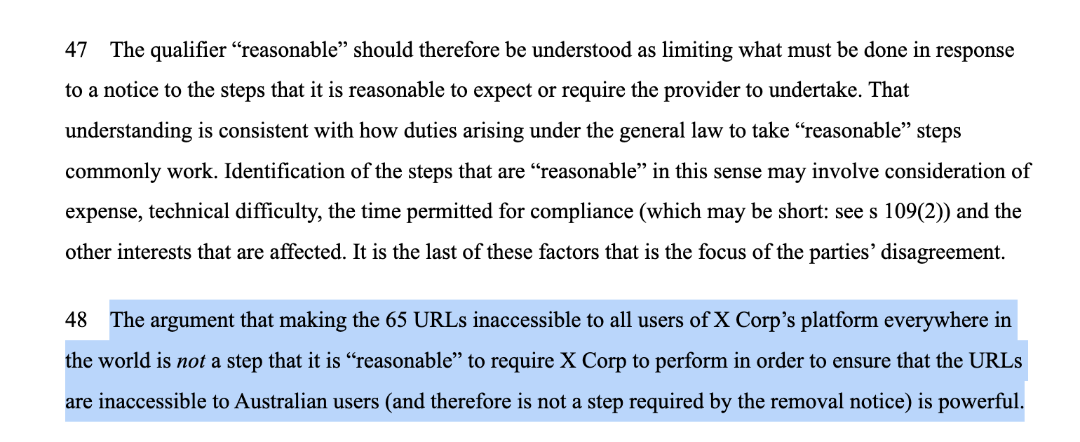 In short, Justice Kennett determined that X took "reasonable" steps to block the stabbing content as required under Australian law, and that eSafety's request for a global ban was not reasonable.