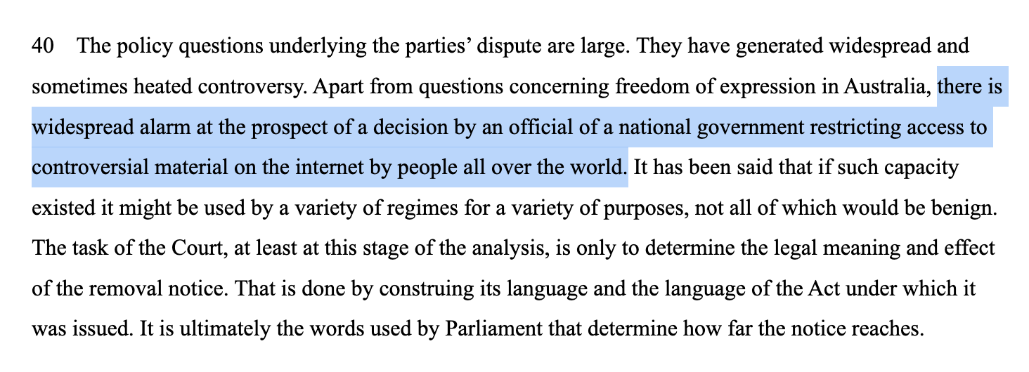 Justice Kennett acknowledged that, “…there is widespread alarm at the prospect of a decision by an official of a national government restricting access to controversial material on the internet by people all over the world.”
