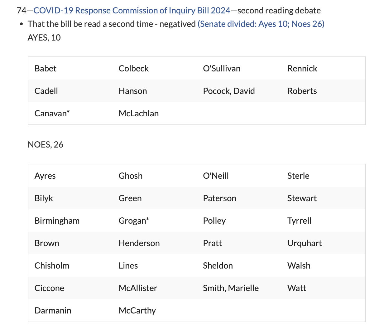 During speaking time, senators who sponsored the bill argued that a Covid Commission of Inquiry is needed so that Australia can finally move on from Covid with a good plan in place for future pandemics. A proper inquiry would get to the bottom of what went wrong (and what went right) to restore trust in public health, they said.