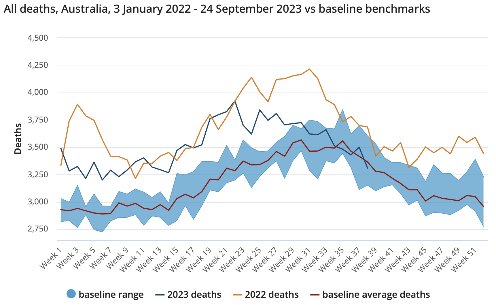 Australia has recorded more deaths than expected in the past several years, with some states experiencing up to 17% excess mortality. This trend is ongoing, with the latest reporting from the ABS estimating 12,377 excess deaths for the first three quarters of 2023, 9.9% above the expected baseline.