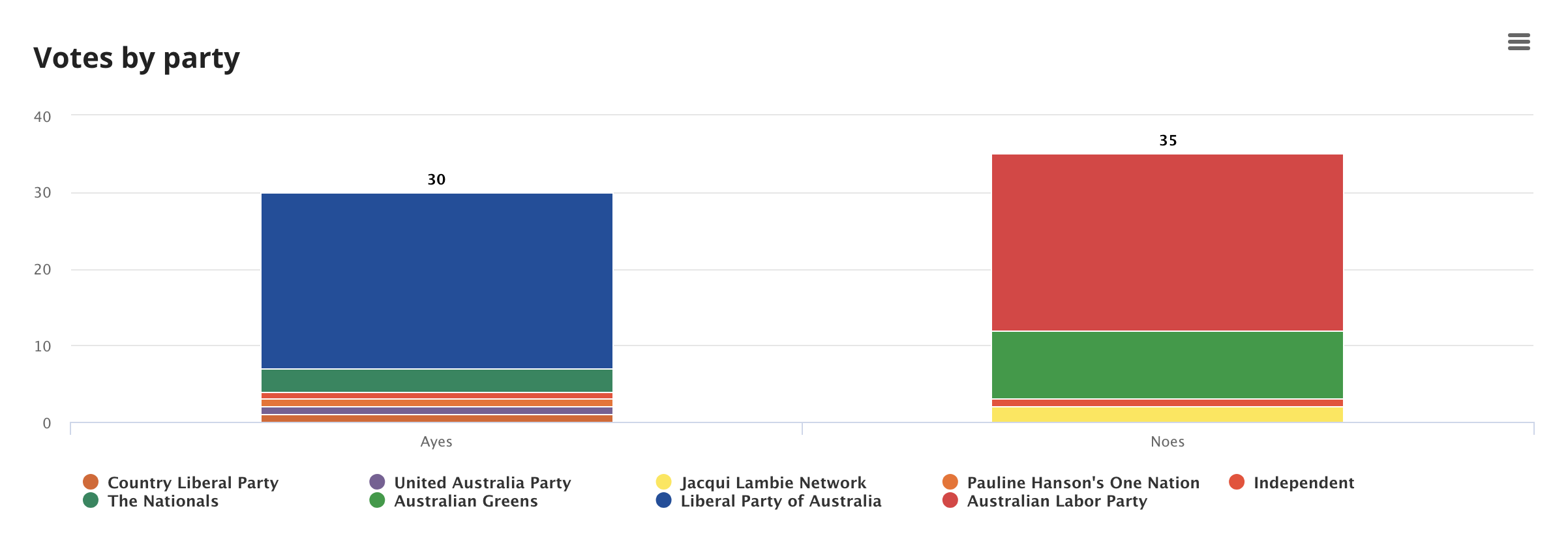 The Noes had it 35:30, with Labour, the Greens, the Jacqui Lambie Network and independent Lydia Thorpe all voting to reject the motion.