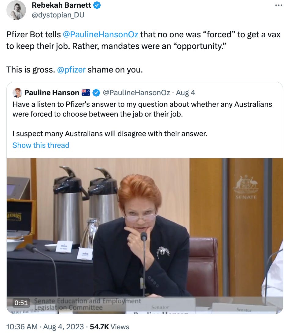 Told the Committee that Australians subjected to coercive vaccine mandates were not forced to take their product. Rather, they were offered an “opportunity.” An opportunity to lose their income, be locked out of gyms, cafes, concert venues, community clubs, visiting aged care and hospitals, and in my home state, to be banned from purchasing alcohol - even via drive-thru.