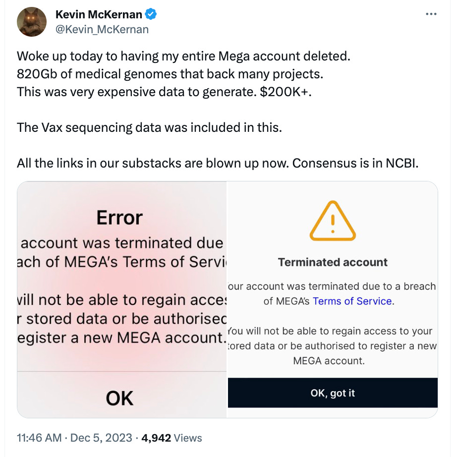 In a thread posted to X on Monday 4 December Boston time* (where McKernan is based), McKernan says he woke up to find that his entire MEGA account, including medical genome sequencing and vaccine sequencing data, with an estimated value of US$200,000, had been suddenly deleted. McKernan is one of the leading scientists involved in researching DNA contamination in the mRNA Covid vaccines.