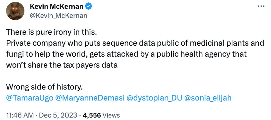 “There is pure irony in this. Private company who puts sequence data public of medicinal plants and fungi to help the world, gets attacked by a public health agency that won’t share the tax payers data…Wrong side of history,” wrote McKernan, who heads up medical cannabis company Medicinal Genomics.
