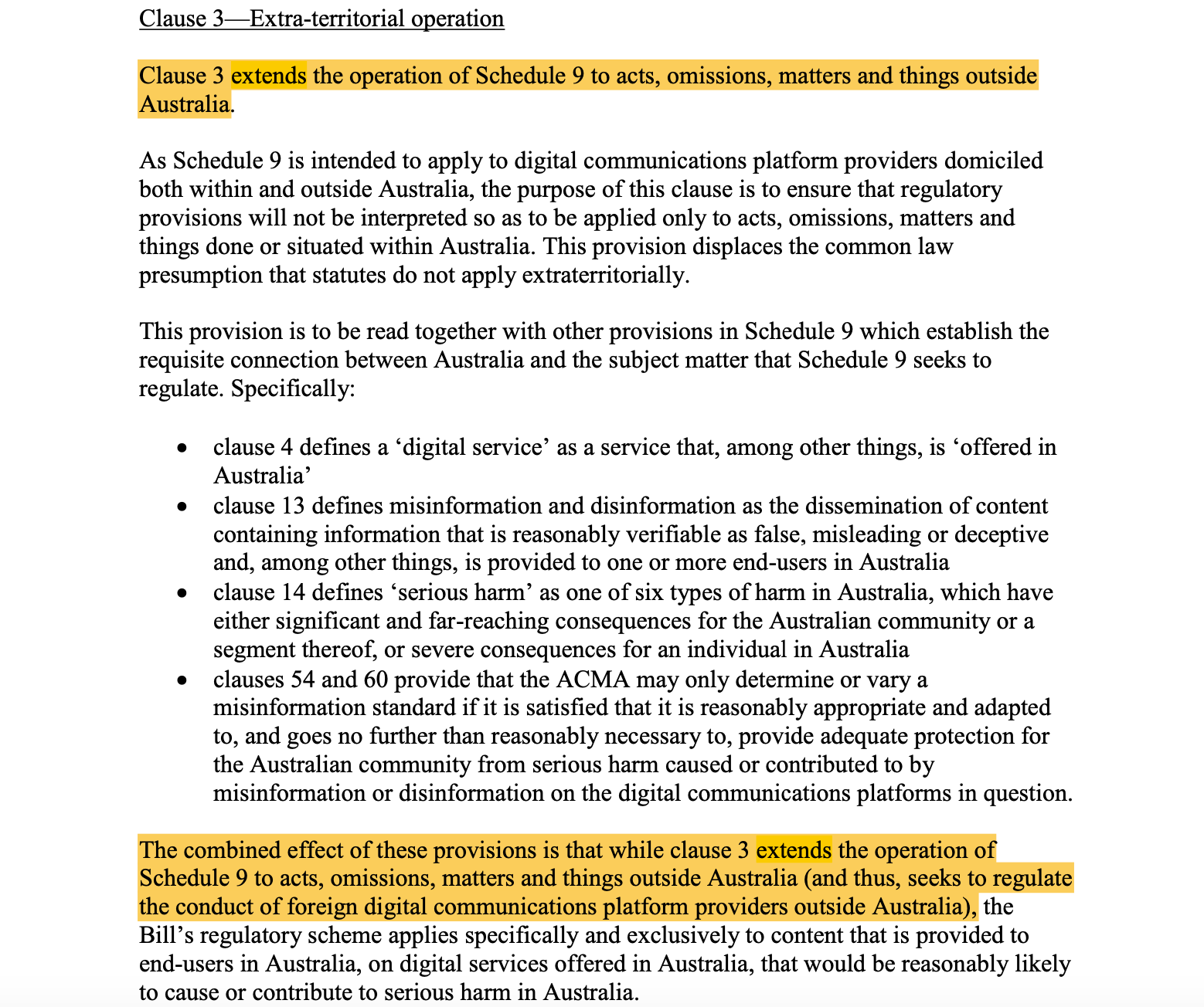 has written on Substack that the new legislation will regulate content globally, not just within Australia (eSafety Commissioner Julie Inman Grant is no doubt angling for such an amendment to the Online Safety Act as well).As stated in the explanatory memorandum, “Clause 3 [of the misinformation bill] extends the operation of Schedule 9 of the Broadcasting Services Act to acts, omissions, matters, and things outside Australia.”