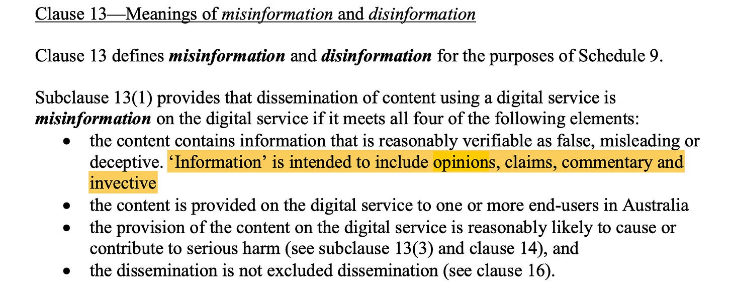 Another revelation is that the legislation will definitely apply to opinions. Per the explanatory memorandum accompanying the bill, “information” that could be censored as misinformation “is intended to include opinions, claims, commentary and invective.”