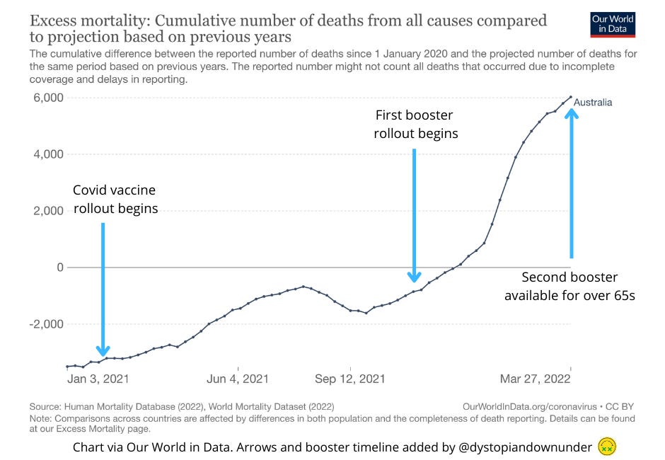 This might be a good time to recap on Australian excess all-cause deaths. They’re up, by quite a bit. The below chart shows excess deaths up to end of first quarter 2022, which coincided with the rollout of the second booster for over 65s. There’s a reporting lag on excess deaths, so we will have to wait another month or two to see if the correlation holds over the second quarter of 2022.