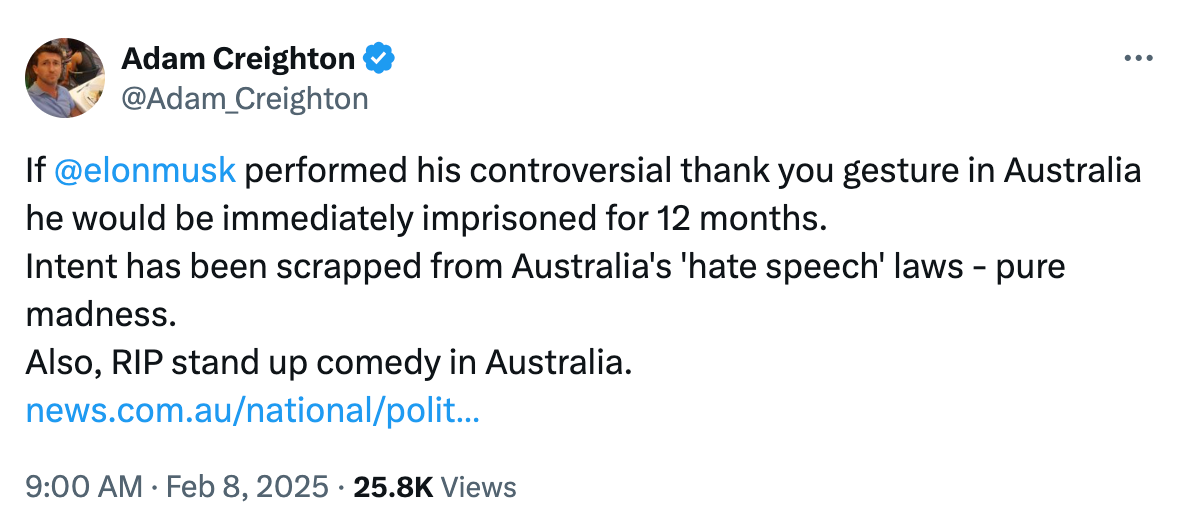 Journalist Adam Creighton opined, “RIP stand up comedy in Australia.” Ironically, Senator Babet once called for the deportation of a comedian for joking that he wished the attempted assassination of Donald Trump had been successful.