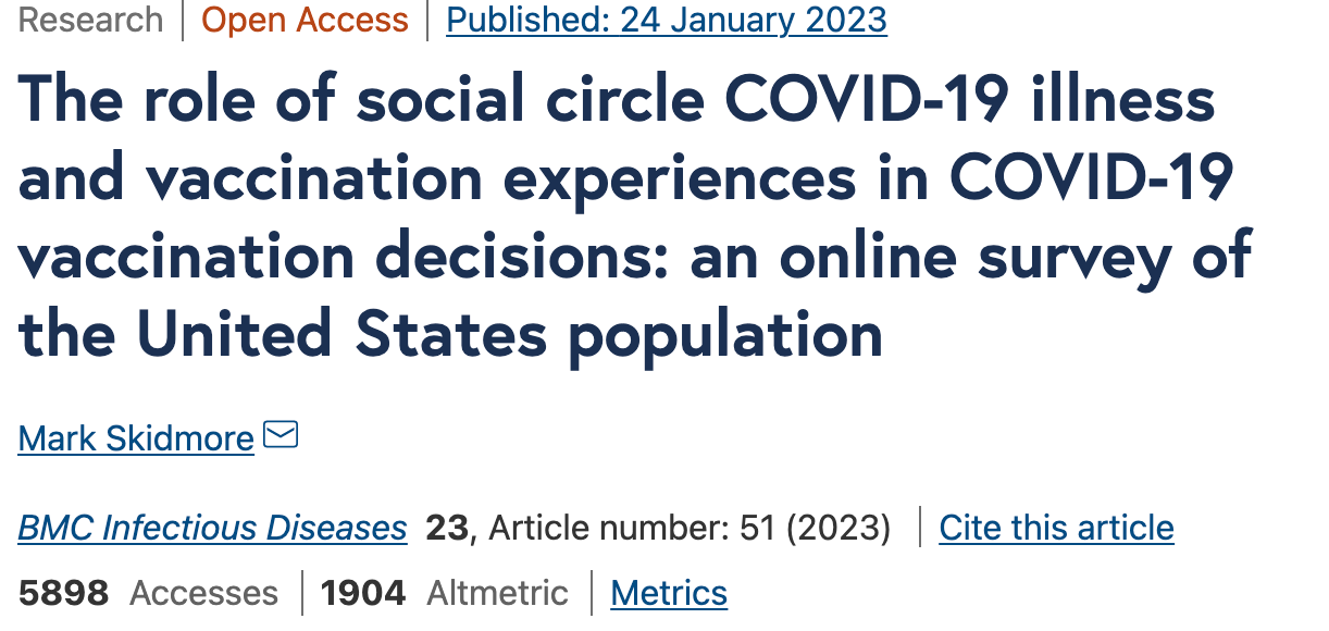 Skidmore is now working on paper using data from the same survey that evaluates factors in support of (or opposition to) Covid policies such as lockdowns, vaccine mandates, digital health passports. He is also working on a paper that uses cross-country data to evaluate the degree to which access to hydroxychloroquine (HCQ) helped to reduce Covid fatalities, providing evidence that HCQ saved lives.