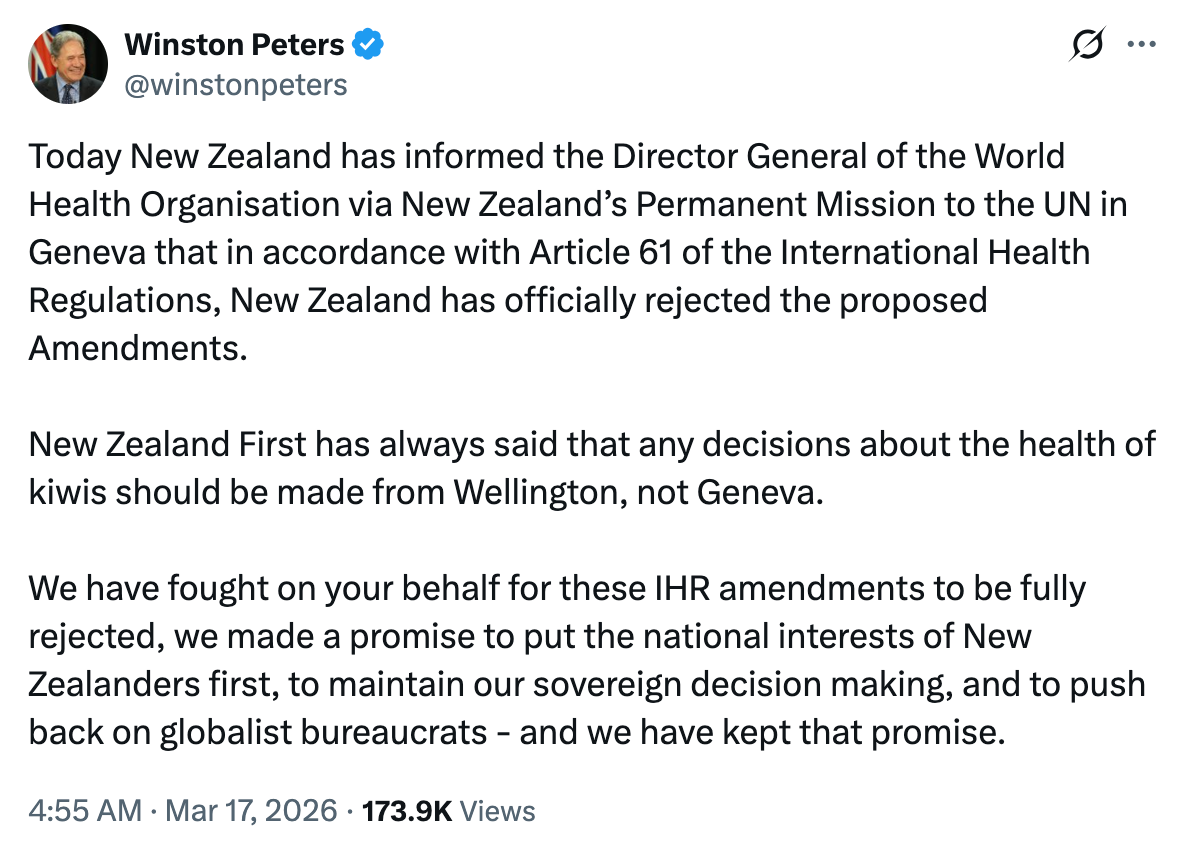 “New Zealand First has always said that any decisions about the health of kiwis should be made from Wellington, not Geneva,” Peters posted to X.