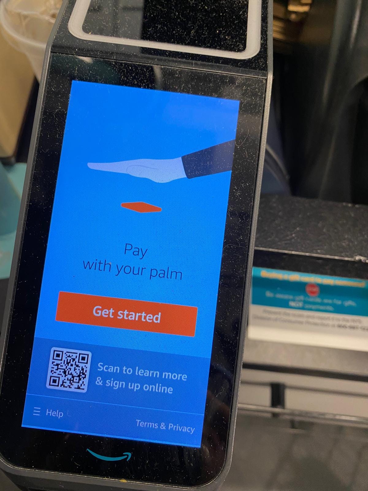 People can pay for their groceries by scanning their palm. I took this photo at Whole Foods, where the checkout worker told me that members can link their palm scan up to their debit card to shop with biometrics.