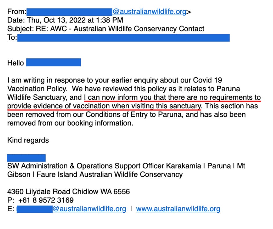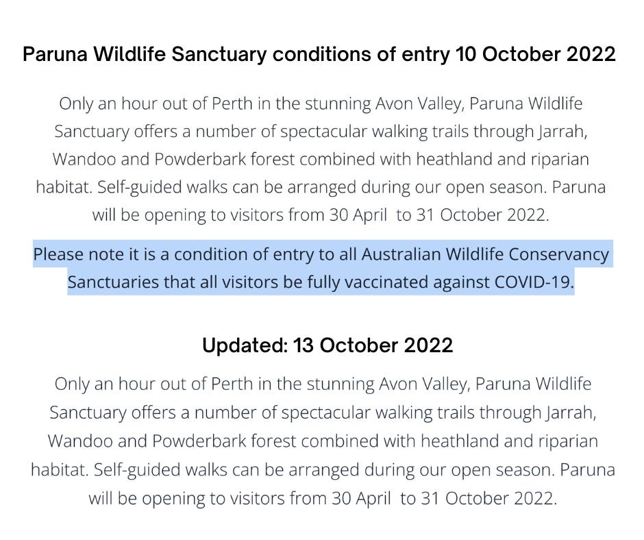 Paruna Wildlife Sanctuary has reversed its position and is now following the science. As of today, proof of Covid vaccination is not required for entry to the park.