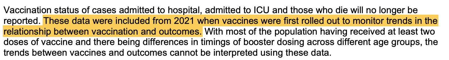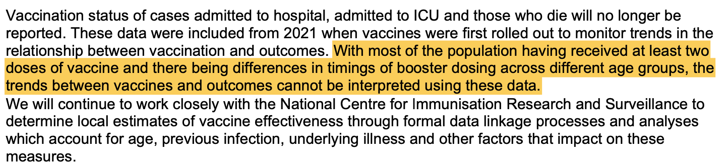 Well that’s weird, because as you’ll recall from the top of this article, NSW Health expressly stated that the purpose of collecting and reporting data on the vaccination status of cases admitted to hospital, ICU and those who died with Covid was to, “monitor trends in the relationship between vaccination and outcomes.”