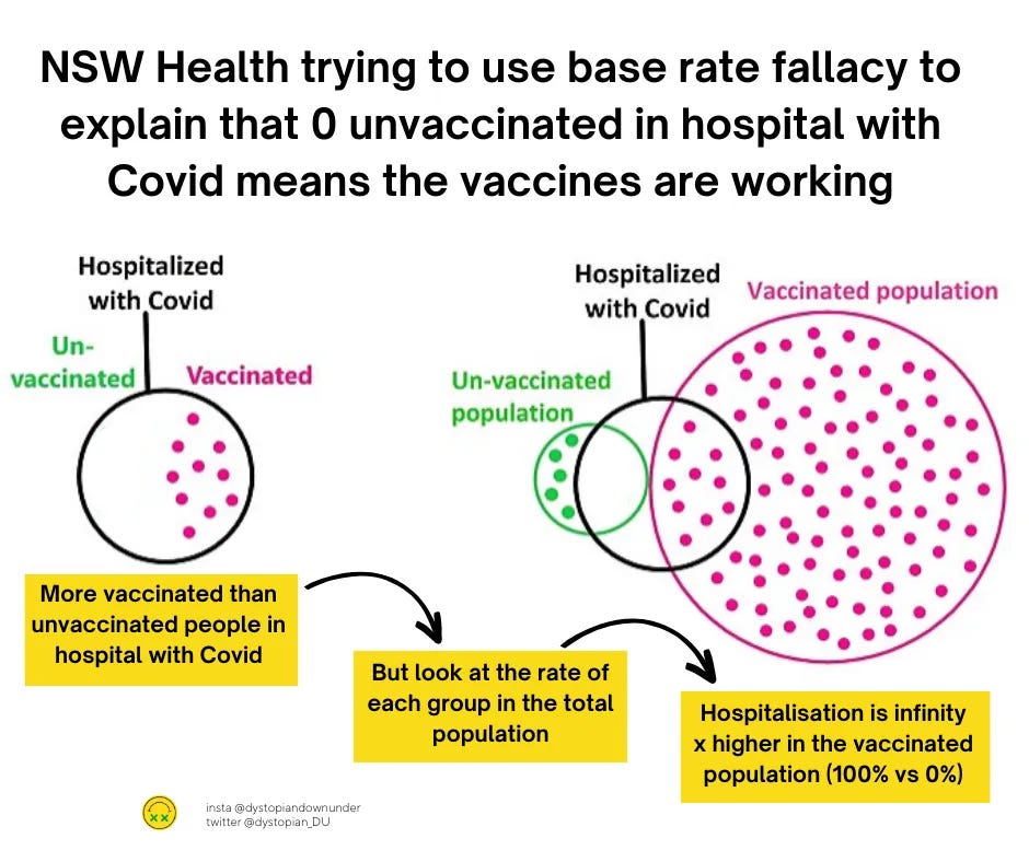 In weeks when there were zero unvaccinated people in hospital with Covid, NSW Health resorted to base rate fallacy. The unvaccinated, being a small proportion of the NSW population, were significantly over represented by the number zero.