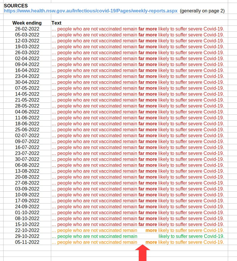 The weasel wording of the GIPA response allows for the possibility that an analysis of NSW Health data for vaccine effectiveness is held by another body or Ministry, with weekly directives being given verbally (not in writing) to NSW Health employees to update the fine print on NSW Health surveillance reports. This explanation requires some suspension of disbelief. An alternative explanation is that the semantic fiddles (likely, more likely, far more likely) are an editorial touch, nothing more.