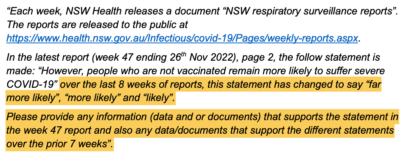 In a GIPA request (the NSW equivalent of FOI), Matt asked NSW Health to provide any information to support the statement, “However, people who are not vaccinated remain more likely to suffer severe COVID-19,” as well as any data/documents to support qualifiers (likely, more likely, far more likely) being changed from week to week.